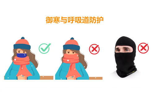 寒冬天气,很多人会佩戴围巾,但围巾阻挡不了新冠病毒,请戴好口罩后再佩戴围巾。同时,头套也不能作为防护装备。